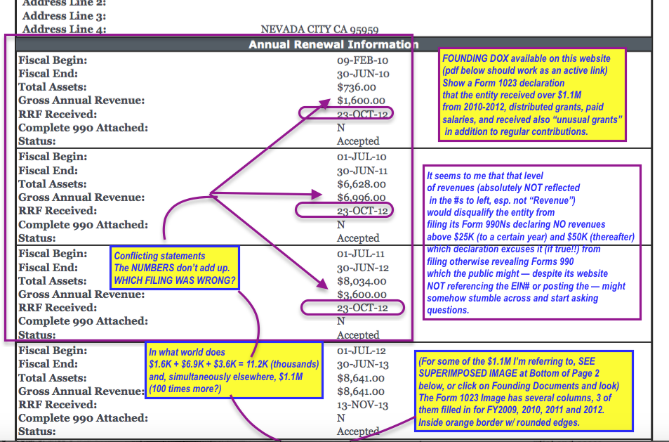 CCJC.org excerpt from p.1 of California OAG Charitable Trust Details (annotated to show the $$ discrepancy from the start with its own reports to the same gov’t agency about its first few years of revenues…)