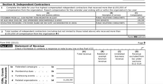 There is a primary individual supporter (could be a person or corporation or trust) (shown by public-disclosure copy of Schedule B of “Excess Contributors” for 2014 and 2015 (for some reason, the organization didn’t volunteer its year 2013 Form 990) which while redacted, show one year, a contribution of $440K, and another, of both $150K + $90K.