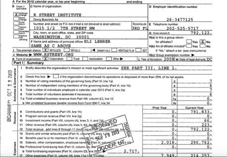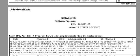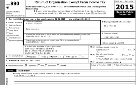 The R Street Institute, EIN#263477125, was only formed in Oct. 2008 (FYE still Dec.), and it seems to have skipped filing tax return for FY2014. (FY2008, the first year the IRS Form 990 asked “legal domicile, year founded, and (a breakdown of how many employees); for FY2010 and 2011 it filed Forms 990EZ (which didn’t ask those questions); changed its name AND stated legal domicile from DC (2008) to VA back to DC and address, most years. Form 990 FY2014 not found in any format (no Form 990-N filings electronic post-card found). The tax return indicating “name change” is missing. The original name was “DC Progress” The first filing spelled its current chairman’s (Elias Rothenberg-Lehrer) wrong, with an “H” instead of an “L”).