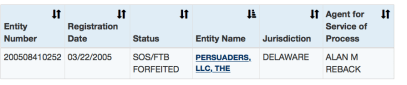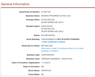 Finally I went to the State of Maryland “DAT” (Dept of Assessments and Taxation) and found not two, but just ONE entity named Demand Progress (anything — it was “Action, Inc.”), and that it was status “not in good standing” (for having not filed its PPR, Personal Property Reports, since 2015).