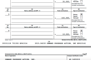 Click Image to Enlarge if needed. Some anomalies: The 501©4 Demand Progress Action Inc gives itself three different EIN#s on all its tax returns (so far I’ve looked at 3 different years’, two of them also on the entity website). ALL show their own Sched R entity to have the exact same name (and legal domicile) “related entity” and even be receiving some funds (around $30K) from it at times, giving this other entity a completely different EIN# which differs in 2015 by a single digit. Bd of Directors is said to receive 990s for review and hasn’t fixed this since 2013 (and where is FY2012 return?). Apparently it also doesn’t bother whoever donated (Sched B images here + below) $440K, $75K, $65K or $11K, etc.) [minor Sched B amts not shown in my screenprints]