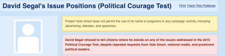 (Project VoteSmart goes on to say that most candidates play it safe and refuse to answer where they stand on key issues, but it’s “fighting back” for 2018 with an added “Do You Know Your Candidates?” feature. David Segal doesn’t seem to lack courage but apparently prefers to speak through at least one nonprofit corporate mouth, i.e., Demand Progress..
