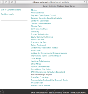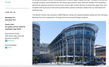That was just a taste of CEL activities in a few short years of either entity’s existence. On looking up the Allston Street Address, the other context is coming back to me (although it’d been lingering in the bck of my consciousness while compiling some of the above. A “Green from the Ground Up” building in Berkeley closely connected with “the Earth Institute,” (as I recall) and called “The David Brower Center” is particularly eager to house environmentally-conscious nonprofits. (See “Current resident list” which no longer includes Citizen Education Laboratory (unless it’s changed its name; note I have no tax return past FY2015). The images should give an idea, otherwise, there’s another link: