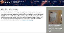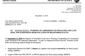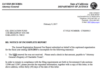 Now it’s Feb. 2017, and the OAG wants its $125.00 fee to go with the FY2014 (FYE 12/31/2015 in the letter = FY2014 for the organization)…So glad to know all those accelerated, incubated, supported, and fiscal-agented projects involving CEL Education Fund are in good hands…For which hands, visit the 990s and look at the boards of directors… For some of the other partner entities (such as the Ford Foundation or Open Society Foundations) with one or the other of the CEL nonprofits, see the website).