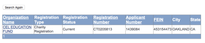 After adding this section, I looked up their California Charitable Registrations by Name-Search first, and found that apparently the Form 990 search database above, while I’m thankful for the search results highlighting the two related entities, again does not show the legal business name (unless the change has been just since 2015). Here are two search results from California OAG RCT (Registered Charity Trust, a familiar website if you follow this blog) showing one has “CEL” written out, but the other (the 501©3) uses the acronym “CEL” instead. They can be correlated with the image above by EIN# shown on both search results: