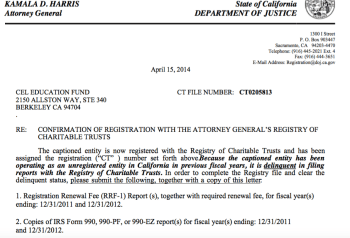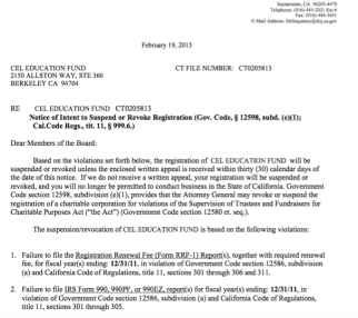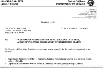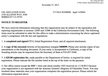 Dec. 24, 2013 “Second Notice to Register” for CEL Educ. Fund in Berkeley (Suite #360 on Allston Way = in the Brower Center building).