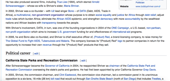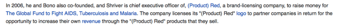 Portion of Bobby Shriver’s (Robert S. Shriver, III) “Wiki” shows the social sphere, political connections aspirations — and a bit on project Product Red and ONE (with ONE having since bought out “Red” of “Product Red.”) “RED” is a brand-licensing company…