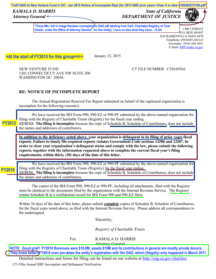 EVERYCRSReport.com: Project of Demand Progress (a 501©3 + 501©4 each w/ fiscal agent~New Venture Fund (formerly Arabella Legacy Fund), Sixteen Thirty Fund), the R Street Institute (formerly DC Progress). So, Will the Real Sponsors Step Out from behind their Fiscal Agents, WITH NameTags, or Shall I Continue Outing Them?) [Last revised Sept.11, published “As-Is” Sept. 21, 2017] » Calif OAG to New Venture Fund in DC~ Jan 2015 Notice of Incomplete Rept (for 2013 AND prior years~Clear it or else~)169362015169