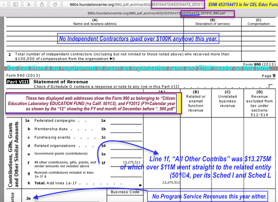 EVERYCRSReport.com: Project of Demand Progress (a 501©3 + 501©4 each w/ fiscal agent~New Venture Fund (formerly Arabella Legacy Fund), Sixteen Thirty Fund), the R Street Institute (formerly DC Progress). So, Will the Real Sponsors Step Out from behind their Fiscal Agents, WITH NameTags, or Shall I Continue Outing Them?) [Last revised Sept.11, published “As-Is” Sept. 21, 2017] » CEL Educ Fund (EIN#453154473) gives receives $13’275M private contribs FY2013 Screen Shot 2017Sep23 @2.59PM