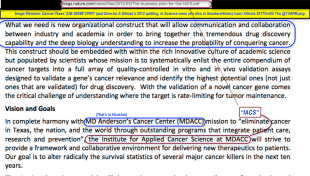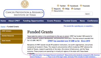 It seems ironic somehow….The “CPRIT” images are more placeholders than explanations; I read more on it. It seems that CPRIT may be involved with the TCORS….The story of Gilman’s quitting (and not him only) and why is covered in several articles, and easily searchable on-line. The next four images are just placeholders/reminders of who is CPRIT (two images with tan borders) and that there is a story behind the executive director quitting in protest (over how grants were awarded) within four short years…. (the other two images). From what I can tell also, the “CPRIT” although not exactly named, seems to also be among those TCORS centers (I saw awards to both Houston — MDACC, and Austin, where it is, in a described project)…