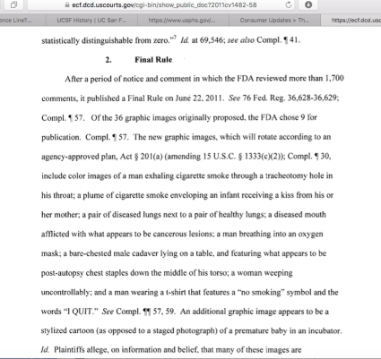 FDA was given authority over tobacco, I believe, through the “Tobacco Control Act” of 2009, or in its longer form, Family Smoking Prevention and Tobacco Control Act. Recently more rules (built into the act) added more tobacco and tobacco substitute products to its regulatory authority under interstate commerce and commerce with Indian tribes (when it comes to sales and advertising of the products). Tobacco companies continue to challenge these FDA rules, sometimes winning (I cited one Civil Case in U.S. District Court of District of Columbia, with images below, seeking summary judgment to protest the “emotional-negative response” requirement to add graphic images in addition to the nine text warnings. So long as Tobacco Control Ligitation continues, with such major prize money at both sides of it (whether pro, or con), we can expect continuing requirement as taxpayers to continue funding the defensive litigation.