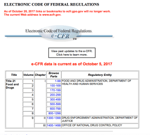 NOTICE THE TABS, incl. Far Right. Also, just showing that FDA is under TItle 21. from “AccessData.FDA.gov”. See internal link to e-CFR (ECFR.gov for more info, at this time seems to be kept current and have had a recent url simplification(formerly was ecfr.GPO.gov)