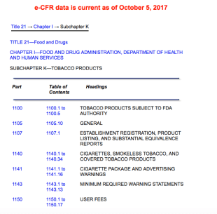 and the (FDA) is more famously associated with regulating pharmaceuticals. Since 2009?). FDA described in 21CFR (Code of Federal Regulations) and is “Chapter 21 U.S.C.” See the tabs in next image, current April 2017 with link to find more current given) where “Tobacco Products” are the rightmost tab: