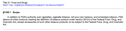 Title 21, Part 1100, “Scope”: “In addition to FDA’s authority over cigarettes, cigatrette tobacco, roll-your own …and smokeless tobacco…. FDA deems ALL OTHER PRODUCTS MEETING THE DEFINITION OF TOBACCO PRODUCT UNDER SECTION 201(rr) (except accessories) to be subject to the federal FD&Cosmetic Act — except accessories of (the same).