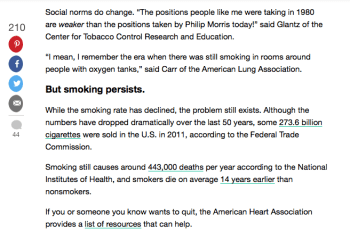 This article, while it has plenty of links (underlined in green), quotes only a few people (see three nearby images) — Glantz, two or three times; a person from the American Lung Association, another from Annenberg Public Policy Center at the University of Pennsylvania (studying cigarette ads). The American Nonsmokers Rights Foundation (I’ve posted; Glantz is one of the directors) is also linked to and references, as well as a quote from “Merchants of Doubt.”