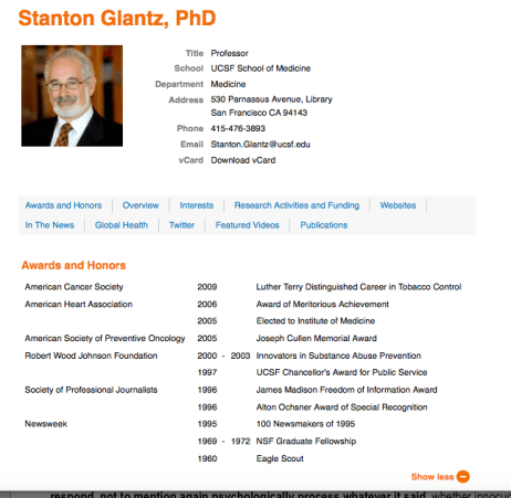 UCSF details from Stanton Glantz, PhD faculty page. Click image to enlarge, or here for the exact link
