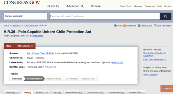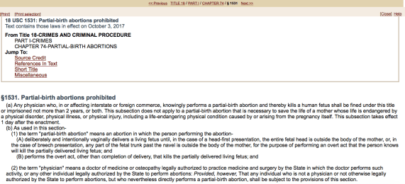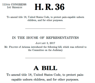 Breitbart.com (I am NO fan!!) at least names the bill and provides a link to its text near the top of his article. From that “H.R.36 link” after the usual “situations” preceding the proposed legislation, I found the justifying authority interesting. I’m also inclosing a partial image of the legislation where it’d appear right after (Section 1531) which is on “partial-birth abortions” which are illegal (and with which I agree, as well as with the reasoning presented for outlawing them):