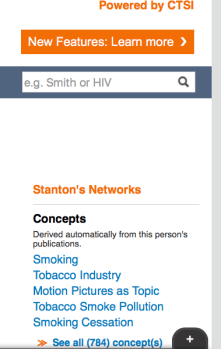 While “Dr. Glantz” is appropriate, and as legitimate as “Professor Glantz,” his degree is PhD, not M.D., and even at UCSF (after all the awards, honors, accomplishments, and publications) I notice there is no c.v. attached. Here’s just a section of the UCSF profile narrative, underneath the image (showing available links to further info, where normally a c.v. might be included, even for an older or distinguished faculty member…). It mentions he’s an Eagle Scout in 1960 — but not anywhere near the top, or before all the promotional/awards/accomplishments/publications narrative — his alma mater (undergrad or grad) or in what is the PhD.*** However, the university website has even added a “Concepts” cloud and annotated its timeline from publications, by cluster and publication markers (blue and red) from among his many concepts over time. The “Concepts” cloud and its amazing details is supported by a government grant and represents a “Translational Center” at the university: