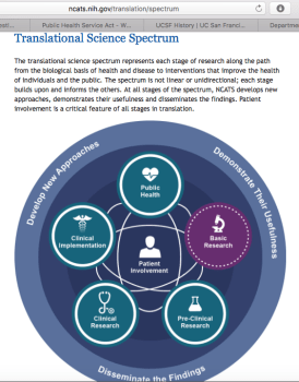 NCATS = National Center to Advance Translational Science, which is recent, significantly funded, issuing grants apparently, and organizationally underneath NIH (the National Institutes of Health). Again, as the site clarifies, or at least clarifies its typical circle-surrounded by circles with a human being in the center, surrounded by ideas and concepts (I call it the “petri dish” organizational model; I believe the NCATS preferred descriptor includes the use of the word “spectrum” and understanding that the surrounding ideas, swirling between each other, also affect each other in mysterious ways) — that doesn’t necessarily mean BASIC science.