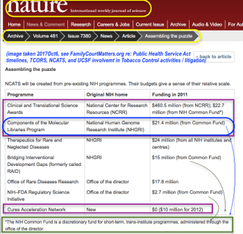 (see yellow-ovals for article/issue#s at Nature Magazine), from Jan. 12, 2012 US translational-science centre gets under way. fine arrows call attention to footer on the discretionary NIH Common Fund.