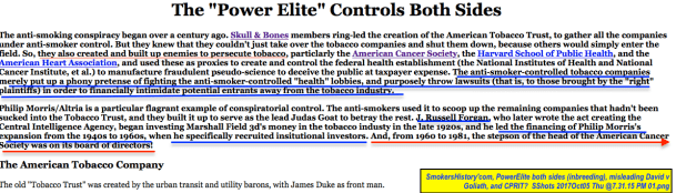 I keep, however, remembering just how much rings true from readings (and separate look-ups of many of the organizations referenced) in “smokershistory.com,” none of which concerns were allayed by what came up in writing this post, with its new discoveries about how the massive NIH funding seeks to specialize and accelerate the behavioral modification interventions, globally. As was said, the same elite controlled both sides, and the appearance and constant claim of “David v. Goliath” (with American Cancer Society — later Association) among the Davids (i.e., the anti-smokers movement were the little guys) which their collective, corporate, social sphere, academic (Yale, Harvard, etc.) and marriage relationships over time, simply doesn’t bear out.