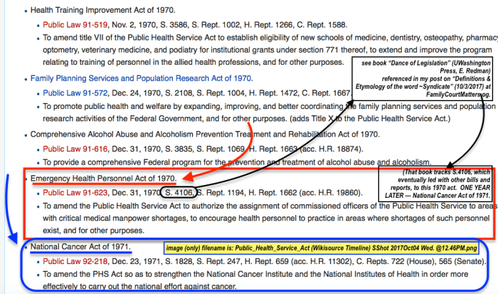 Public Health Service Act Timelines since 1944 through Affordable Care Act of 2010 (Incl. contributing Bill S.4108, right before before National Cancer Act of 1971). See also Tobacco Control Act of 2009 and NIH-FDA-related updates, Like: TCORS’ (so far) 14 Regulatory Science Resource Centers, or NCATS (2012ff) to better Advance Translational Science; predictably with continued Big Tobacco Litigation (protesting First Amendmt. Violations promoted by Tobacco Control Act of 2009) — and let’s not forget UCSF’s Multi-million-dollar, NIH- or FDA-sponsored: Centers, Institutes, and Famous Anti-smoking Professor. [Publ. Oct. 7 2017] » Public_Health_Service_Act (Wikisource Timeline) SShot 2017Oct04 Wed. @12.46PM