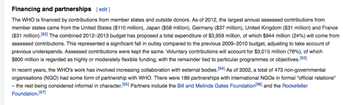 Wiki on the financing of WHO, US the leading payee. Dated to 2012. Notice partner foundations listed also. Consider vaccination movements (GAVI Alliance, drive to vaccinate ¼ billion, or million (and I do forget which) of the world’s under-developed children by 2015. I was researching GAVI as a major WDC nonprofit years ago, and posted on it with interesting back-stories of the leadership, at my other blog Cold,Hard.Fact$. Search term on that blog (for that post: “PowderJect.” .