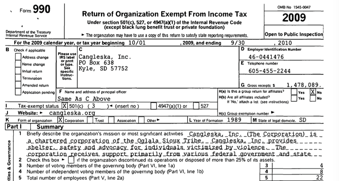 Cangleska Inc (SD, EIN#46-0441476) Forms 990 mostly 2007 + 2008 excerpts~ 2017Oct21 (8 images, self-explanatory)