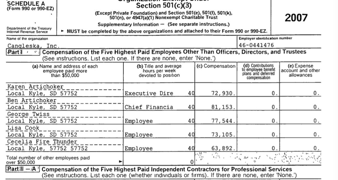 Cangleska Inc (SD, EIN#46-0441476) Forms 990 mostly 2007 + 2008 excerpts~ 2017Oct21 (8 images, self-explanatory)