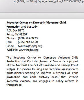 It also claims the “National Resource Center on DV: Child Abuse and Custody” which the newsletter appears in part to represent, dated back only about five years to 2003). The key feature, however, is that NCJFCJ is the sponsoring entity; who they are as an organization. The public (HHS) funded this project (see nearby image). NCJFCJ years earlier was deeply involved with the Greenbook Initiative also, opposite or with the then-“Family Violence Prevention Fund” (namechange to “Futures without Violence” occurred ca. 2010).