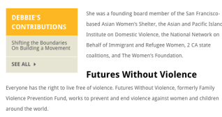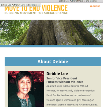 Meanwhile also Debbie J. Lee, still (at latest return) Board Chairman of that entity is also working with “Move to End Violence” (a “10-year initiative” of the NoVo Foundation (i.e., not yet spun off as its own entity) and I see incorporating again mens’ rights groups — “A Call To Men” — Open Society Institute, and others), which website acknowledges Ms. Lee’s having been Futures without Violence (formerly FVPF until 2010) staff since 1980 (!!). (“Futures” itself being a major player in this field and historically well-funded by both HHS and USDOJ; it’s also no runnning related entities involving real estate acquisition and I guess development, on the SF Praesidio and in general doing well, last I looked, about $40M assets well….)