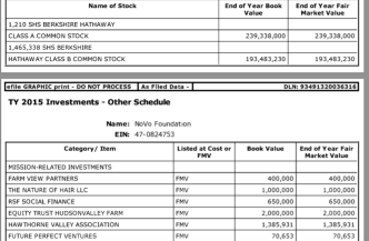 Just general FYI: Some other assets of the NoVo Foundation. “The Nature of Hair LLC” is based in Sausalito, CA, I looked it up later. Wonder how it did in the recent California fires. It had a fairly recent (2014?) IPO, $2M or 2M (I forget which offhand) shares issued per some SEC filings; you can see $1M here held by NoVo Foundation). Talks about green chemistry. Notice: “Mission-related Investments” reads “0” — that’s not how NoVo Fndtn does its tax-exempt purpose work.