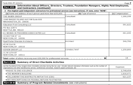 I don’t recognize the “Other Investments” particularly, but you can see where most of the assets are held. Also notice, elsewhere on the return, “Mission Related Investments are blank (as the row is here –I don’t know why it’s even included), but above, the direct charitable activities are listed, and include “MoveToEndViolence” as a primary one. (i.e., Direct charitable activities =/= (entity’s) Mission-related Investments categories). Direct action vs. investments.