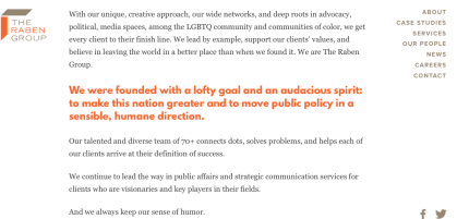 Also “Finally, as a certified LGBT Business Enterprise, we are able to build relationships with America’s leading corporations to advance our clients’ goals.”