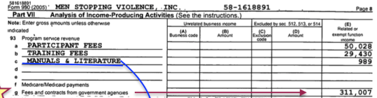 - MenStoppingViolence EIN#581618891 FY2005 (24pp (990) showing 311K of 537K (of which 391K Prog service) revs are GOVT FEES+CONTRACTS (PtVII Ln93g) (and its budget deficit)