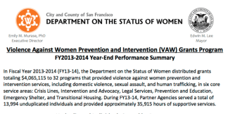 Click to enlarge or click here for entire SF report 2013-2014 on VAWA recipient activities, referencing $4M distributed that year to 32 “partner agencies.” (Some I recognize as also Tides projects). It doesn’t show the non-entity SFDVC, however does list some identified on the Consortium’s identified network.