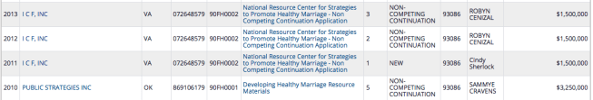 but the only other entity getting a “90FH00##” grant raked in even more and was also a for-profit PR firm — in Oklahoma. Public Strategies, Inc., deeply involved from the start with the “Oklahoma Marriage Initiative.” (Saved Search) showing all three and that Public Strategies, Inc. got first $2M, then (4 yrs in a row, “noncompeting continuation) $3.25M ANNUALLY for “developing materials.” This is an advanced search (I picked the columns displayed. Above was a basic “Award”search, so picking columns wasn’t an option.