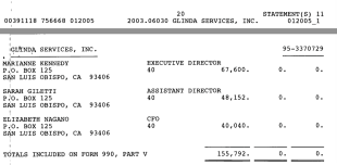 EIN#95-3370729 under a different org. name, FY2003 (see header on image). Ms. Kennedy and two other women were paid officers, total pay for all three only $155.7K. This is ODD: The org. name GLINDA SErVICES, INC., bears NO resemblance to the website shown on the return, womensshelterSLO.org. Why? [2003 return from “990finder” HERE