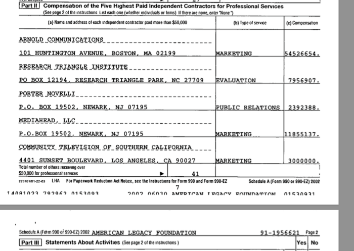 Amer. Legacy Fndtn FY2002, showing major subcontractors — no commas, but count the digits — that’s $54M to Arnold Communications (which by then was called Arnold Worldwide, anyhow — see MA entity records).