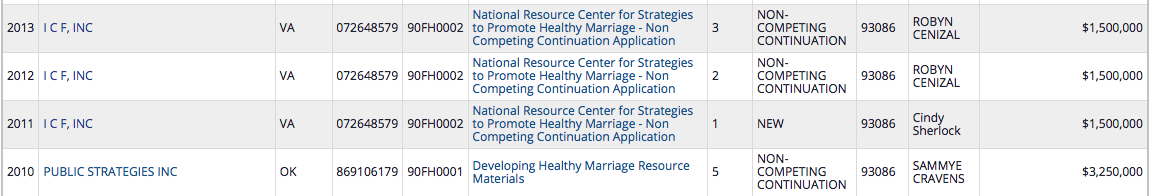 Click on image to see the saved search, which includes grants 90FH0001 and “0003” as well. This just shows the predecessor grant to “I C F Inc.”