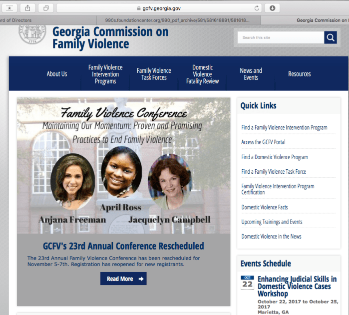 Current look at GA Commission on Family Violence Pls. notice “Enhancing Judicial Skills” at bottom right. This just took place Oct. 22, 2017! Below (but not in image) a Sept. one was for DV advocates.
