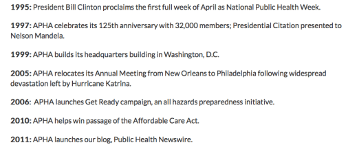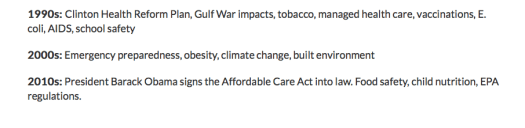 I’m looking in 2017, but APHA finds no memorable events to report since passage of Affordable Care Act… (All downhill from here with a Republican in the White House??…).Notice 1990s, Tobacco” and “Clinton health reform plan”