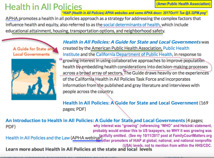 Searching my desktop (vs. this blog) shows that in May/June 2017, having discovered this HiAP, I was deeply concerned about it. One of those folders involves a nonprofit “Prevention Institute” in Oakland, California, which was promoting HiAP policies and (says folder label) working alongside the very large PHI (Public Health Institute, also in Oakland and often-cited as partnering with the State of California “Strategic Growth Council” in HiAP matters. That PHI is doing so is mentioned also on the American Public Health Association (APHA.org) website, too. It’s credited in the state HiAP “FAQs” sheet too.