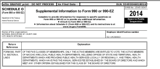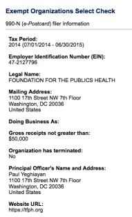 Part VIIB has room for five entries, anything over that is not shown the public. They reported 9 total. I’ll post an image below this next table of tax returns for NACCHO. I’d post one for the Foundation for Public’s Health — but there seems to be none. It filed a postcard Form 990-N for FY2014 only, (so where’s for FY2015? It’s now over one year (1 ¼ yrs) past fiscal year-end for 2015) per the IRS, declaring income under $50K. Of this, the Form 990 for NACCHO says $14K+ came as its only grant for the year — to its related entity. Both are in Washington, D.C.