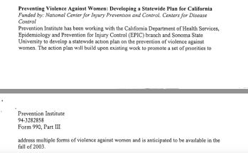 Prevention Institute, FY2004, last page (detail belongs on IRS form proper, one of two pages like this one) referencing violence and healthcare. Note this is before passage of Affordable Care Act.