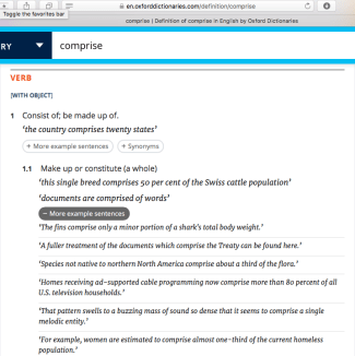 I went looking for backup on whether “comprise” is a transitive (takes a direct object) or intransitive (does not take a direct object, so would need the preposition “of” with it for an INdirect object). While this seems simple enough to me (and is easier to see in some other languages where cases change more than English does), I see that (a) many dictionary sources don’t indicate “v.t.” or “v.i” any more (for verb transitive or verb intransitive), and instead try to explain it in examples — while giving conflicting types of examples (mixing both styles — with or without “of.”) The word comes from the past participle of “comprehend.” I just looked at four or five respectable (or at least well-known) on-line dictionaries, including OED which I THOUGHT used to indicate whether a verb was transitive or intransitive. For example, a common synonym (? or listed as on) is “consists of.” Notice how “the “of” naturally follows the word “consists” which indicates it’s INtransitive. (Does no one learn to diagram sentences according to their parts in school any more?).