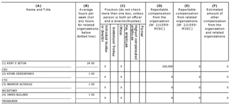 Most of these “Line 11g” expenses, which if over 1/10th (again, the proportion here is high) must be reported on a Schedule O) were going to “Business Consulting” — i.e., mostly unidentified others. Some may be among the Part VIIB independent subcontractors paid over $100K (that year).