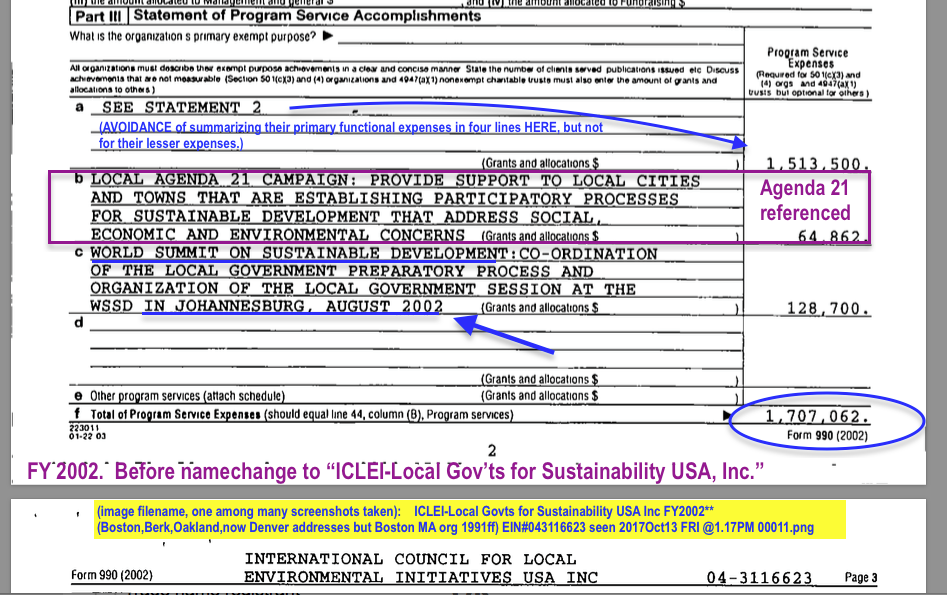 HiAP (HEALTH, not LAW*, in All Policies) Coordinated from Afar, Applied Locally, including throughout the USA. [Published Oct 24, 2017] » ICLEI-Local Govts for Sustainability USA Inc FY2002** (Boston,Berk,Oakland,now Denver addresses but Boston MA org 1991ff) EIN#043116623 seen 2017Oct13 FRI @1.17PM 00011