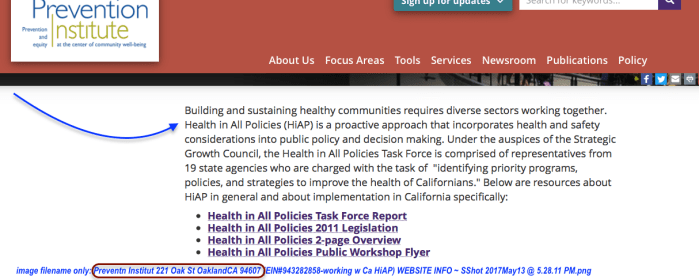 HiAP (HEALTH, not LAW*, in All Policies) Coordinated from Afar, Applied Locally, including throughout the USA. [Published Oct 24, 2017] » Preventn Institut 221 Oak St OaklandCA 94607 (EIN#943282858-working w Ca HiAP) WEBSITE INFO ~ SShot 2017May13 @ 5.28PM