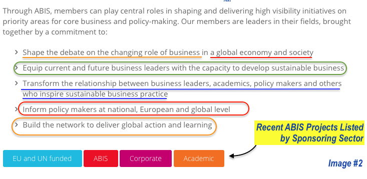 ABIS Image #2 showing some of the organization’s purposes, and delineating four kinds of Projects: EU&UN sponsored (blue) | ABIS (red) | Corp. (purple) | Academic (orange)